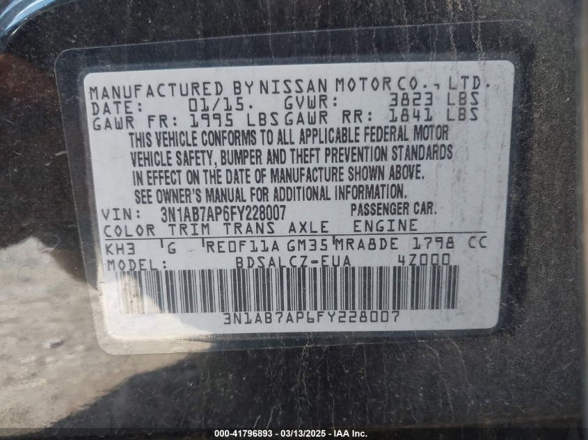 2015 NISSAN SENTRA 2015 року Бензин, 1.8, Передний привод, vin - 3N1AB7AP6FY****** из США