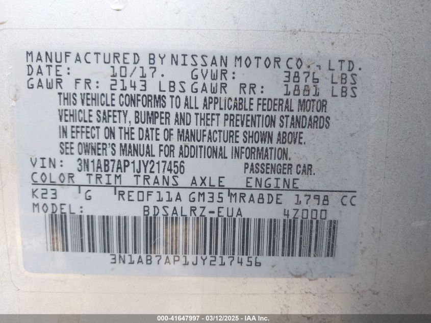Цвет СеребряныйЦилиндры 4Привод Передний приводVIN 3N1AB7AP1JY******Состояние НеизвестноПовреждения Передняя или задняя AutoRIA