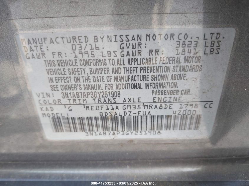 Цвет СерыйЦилиндры 4Привод Передний приводVIN 3N1AB7AP3GY******Состояние НеизвестноПовреждения Передняя и задняяДата аукциона 2025-03-20 AutoRIA