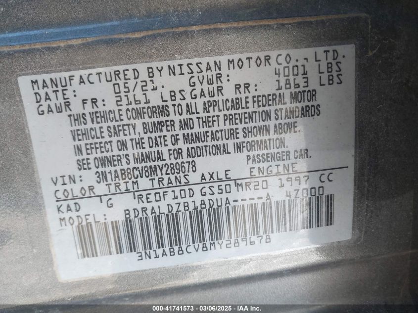 2021 NISSAN SENTRA 2021 року Бензин, 2.0, Передний привод, vin - 3N1AB8CV8MY****** из США