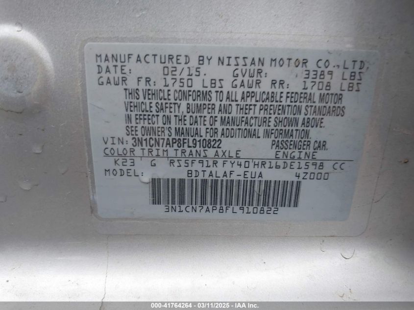 Цвет СеребряныйЦилиндры 4Привод Передний приводVIN 3N1CN7AP8FL******Состояние НеизвестноПовреждения Задняя AutoRIA