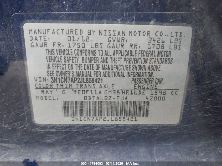 Цвет СинийЦилиндры 4Привод Передний приводVIN 3N1CN7AP2JL******Состояние НеизвестноПовреждения Передняя или задняя AutoRIA