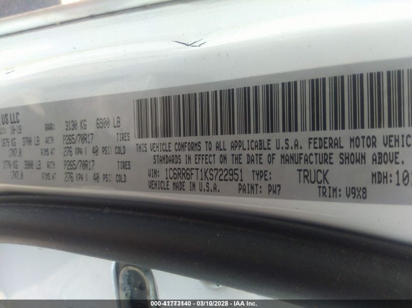 2019 RAM 1500 2019 року Бензин, 5.7, Неизвестно, vin - 1C6RR6FT1KS****** из США