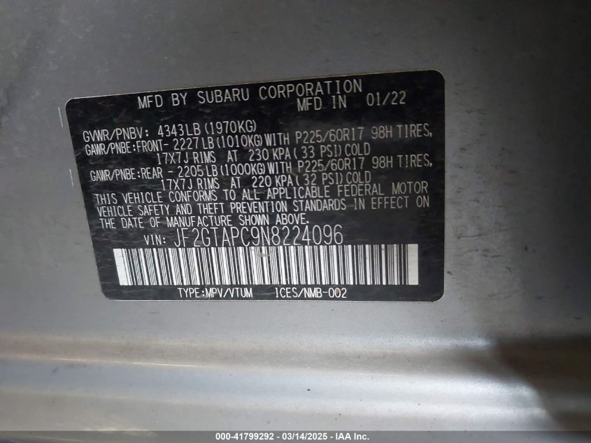 2022 SUBARU CROSSTREK 2022 року Бензин, 2.0, Полный привод, vin - JF2GTAPC9N8****** из США