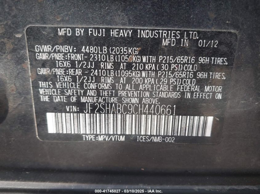 Цвет СерыйЦилиндры 4Привод Полный приводVIN JF2SHABC9CH******Состояние НеизвестноПовреждения Передняя или задняяДата аукциона 2025-03-24 AutoRIA