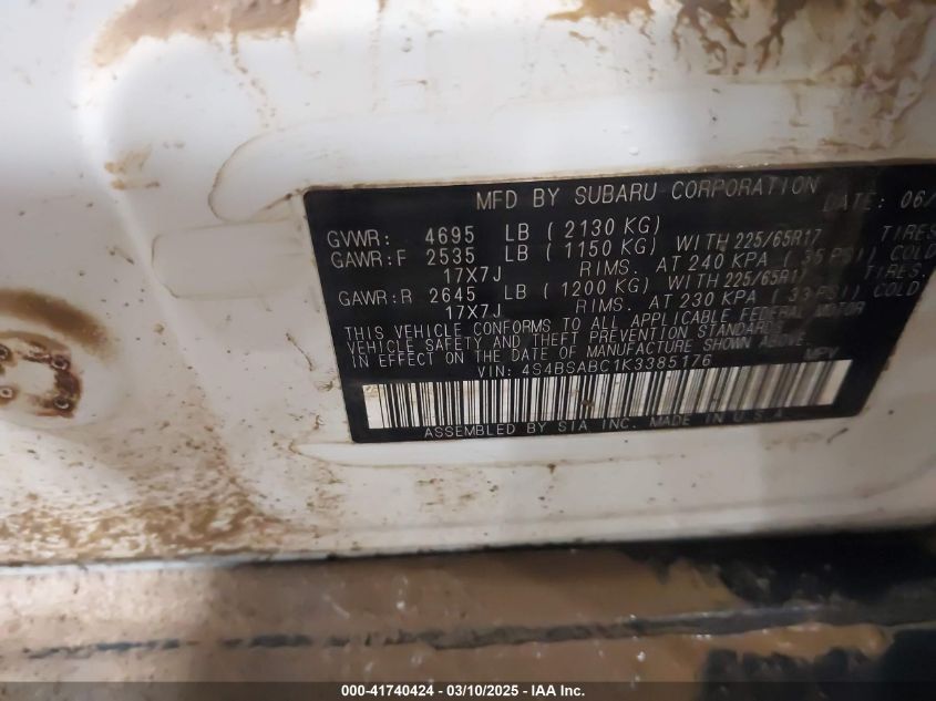 2019 SUBARU OUTBACK 2019 року Бензин, 2.5, Полный привод, vin - 4S4BSABC1K3****** из США