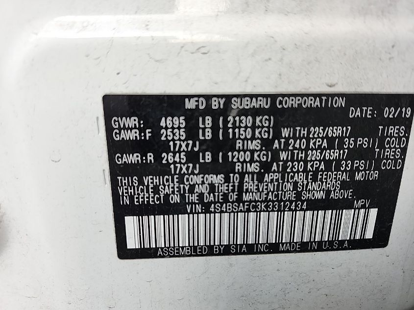 2019 SUBARU OUTBACK 2019 року Бензин, 2.5, Полный привод, vin - 4S4BSAFC3K3****** из США