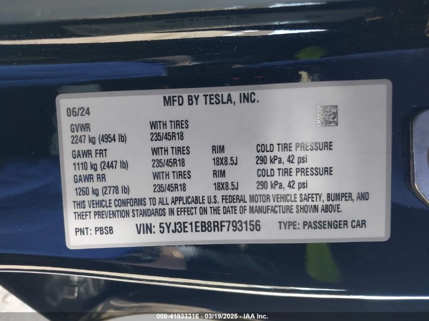 2024 TESLA MODEL 3 2024 року Электрический, U, Полный привод, vin - 5YJ3E1EB8RF****** из США
