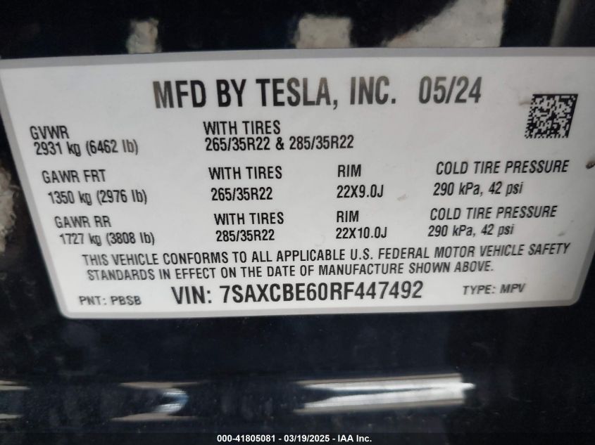 2024 TESLA MODEL X 2024 року Электрический, U, Полный привод, vin - 7SAXCBE60RF****** из США