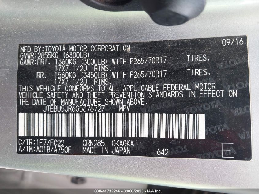 2016 TOYOTA 4RUNNER 2016 року Бензин, 4.0, Полный привод, vin - JTEBU5JR6G5****** из США