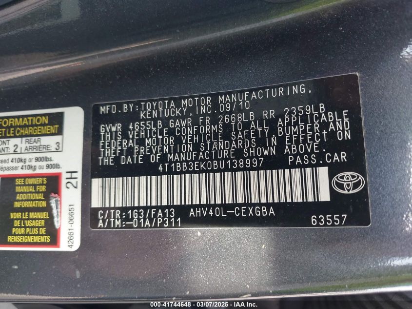 Цвет СеребряныйЦилиндры 4Привод Передний приводVIN 4T1BB3EK0BU******Состояние НеизвестноПовреждения Передняя и задняя AutoRIA