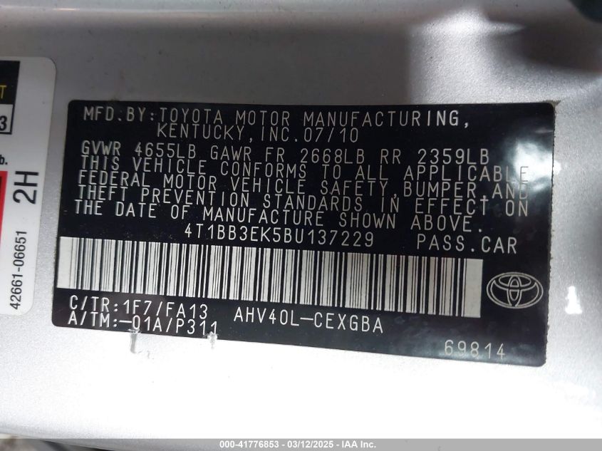 2011 TOYOTA CAMRY HYBRID 2011 року Гибрид, 2.4, Передний привод, vin - 4T1BB3EK5BU****** из США