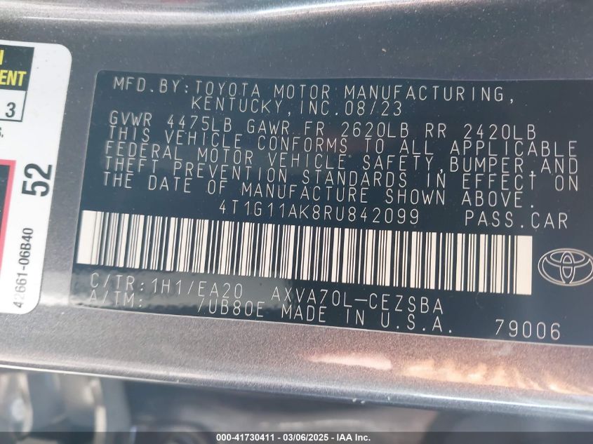 2024 TOYOTA CAMRY 2024 року Бензин, 2.5, Передний привод, vin - 4T1G11AK8RU****** из США
