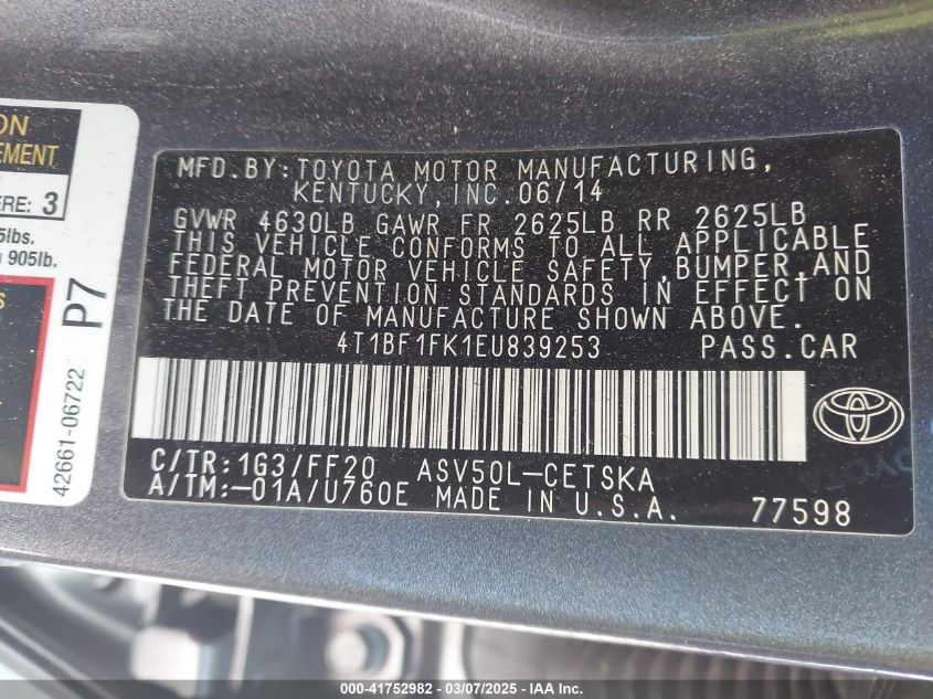Цвет СерыйЦилиндры 4Привод Передний приводVIN 4T1BF1FK1EU******Состояние НеизвестноПовреждения Передняя или задняяДата аукциона 2025-03-26 AutoRIA