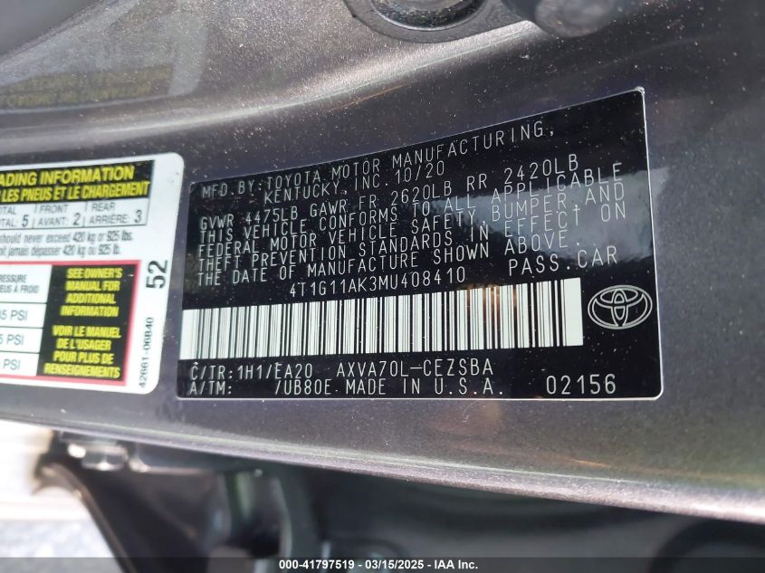 2021 TOYOTA CAMRY 2021 року Бензин, 2.5, Передний привод, vin - 4T1G11AK3MU****** из США