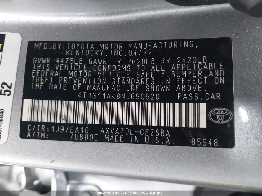 Цвет СеребряныйЦилиндры 4Привод Передний приводVIN 4T1G11AK8NU******Состояние НеизвестноПовреждения Передняя или задняя AutoRIA