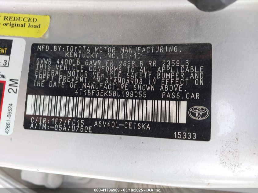 2011 TOYOTA CAMRY 2011 року Бензин, 2.5, Передний привод, vin - 4T1BF3EK5BU****** из США