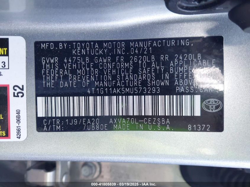 2021 TOYOTA CAMRY 2021 року Бензин, 2.5, Передний привод, vin - 4T1G11AK5MU****** из США