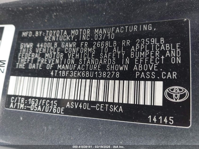 2011 TOYOTA CAMRY 2011 року Бензин, 2.5, Передний привод, vin - 4T1BF3EK6BU****** из США