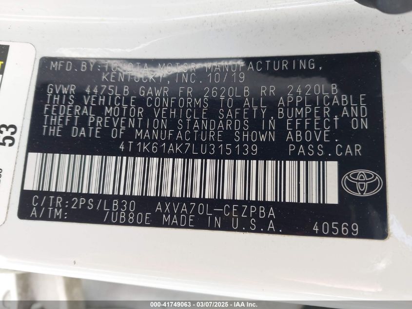 2020 TOYOTA CAMRY 2020 року Бензин, 2.5, Передний привод, vin - 4T1K61AK7LU****** из США