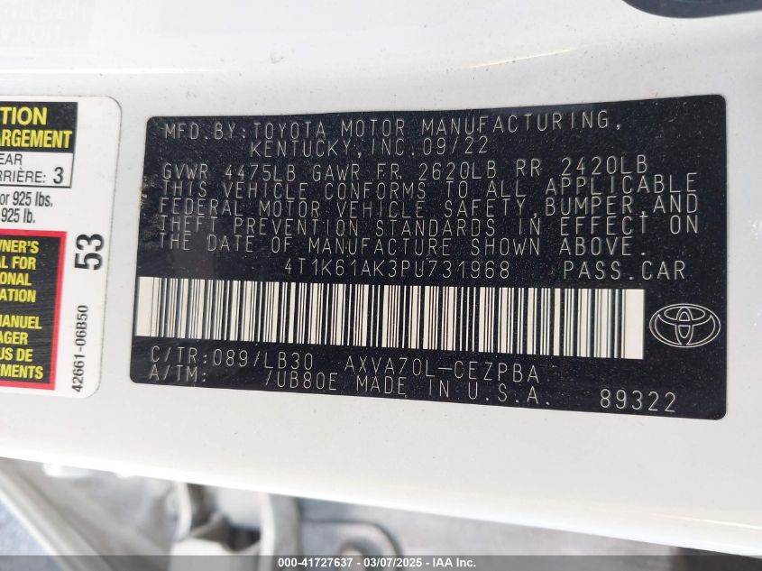 Цвет БелыйЦилиндры 4Привод Передний приводVIN 4T1K61AK3PU******Состояние НеизвестноПовреждения Передняя или задняя AutoRIA