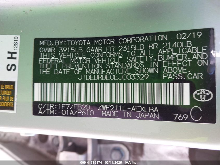 2020 TOYOTA COROLLA 2020 року Гибрид, 1.8, Передний привод, vin - JTDEBRBE0LJ****** из США