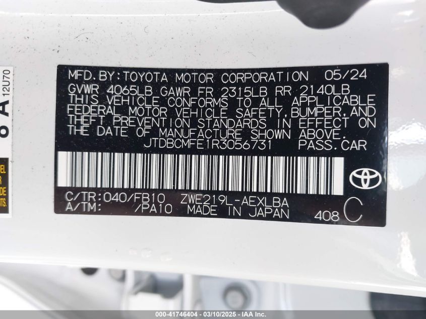 2024 TOYOTA COROLLA 2024 року Гибрид, 1.8, Передний привод, vin - JTDBCMFE1R3****** из США