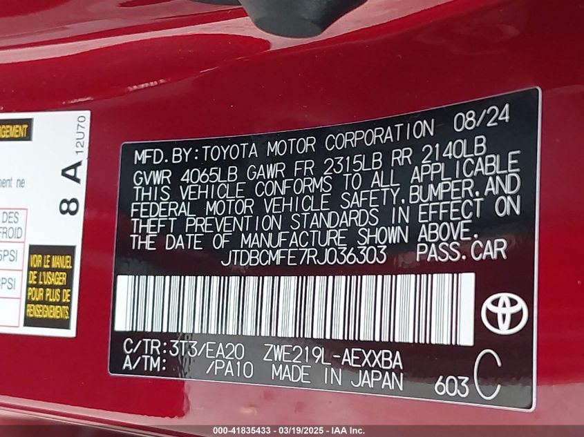 2024 TOYOTA COROLLA 2024 року Гибрид, 1.8, Передний привод, vin - JTDBCMFE7RJ****** из США