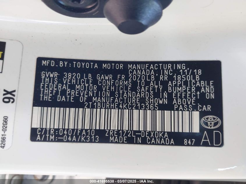 2019 TOYOTA COROLLA 2019 року Бензин, 1.8, Передний привод, vin - 2T1BURHE4KC****** из США