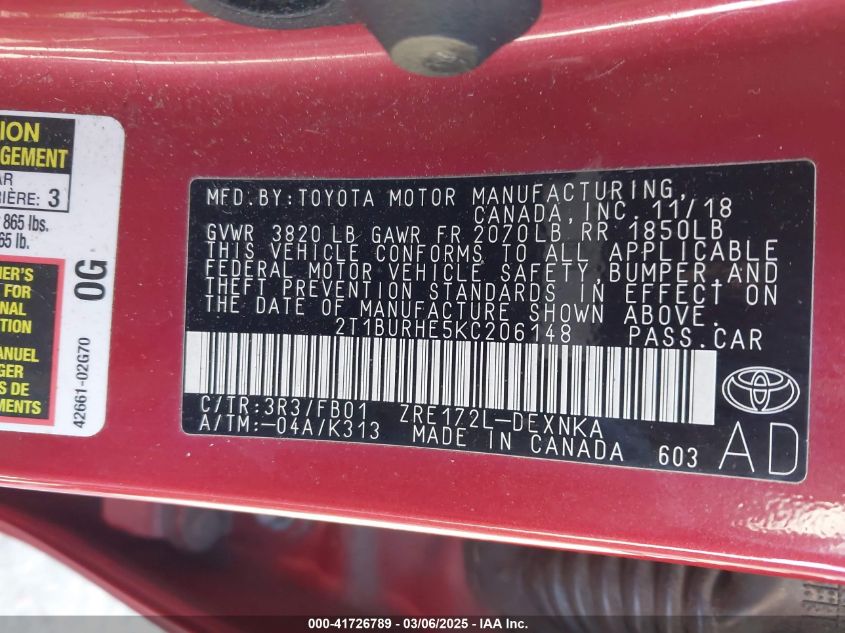 2019 TOYOTA COROLLA 2019 року Бензин, 1.8, Передний привод, vin - 2T1BURHE5KC****** из США