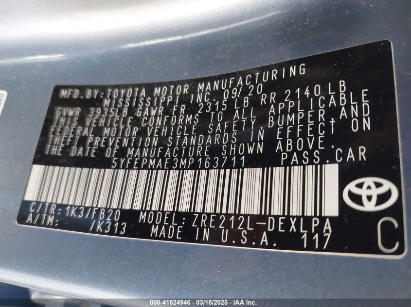 2021 TOYOTA COROLLA 2021 року Бензин, 1.8, Передний привод, vin - 5YFEPMAE3MP****** из США