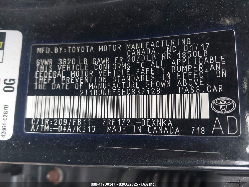 2017 TOYOTA COROLLA 2017 року Бензин, 1.8, Передний привод, vin - 2T1BURHE6HT****** из США