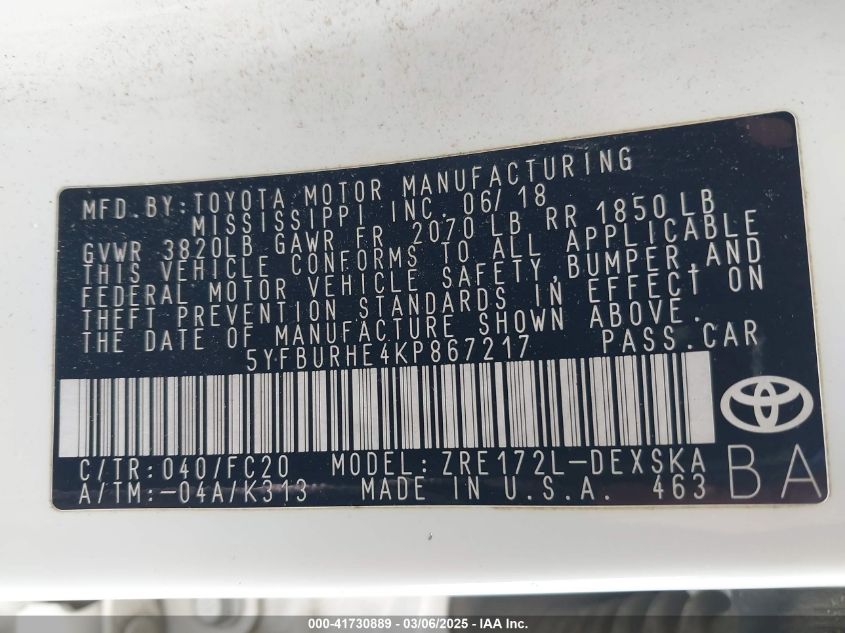 2019 TOYOTA COROLLA 2019 року Бензин, 1.8, Передний привод, vin - 5YFBURHE4KP****** из США
