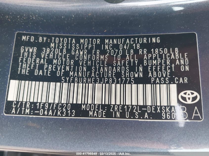 2018 TOYOTA COROLLA 2018 року Бензин, 1.8, Передний привод, vin - 5YFBURHE3JP****** из США