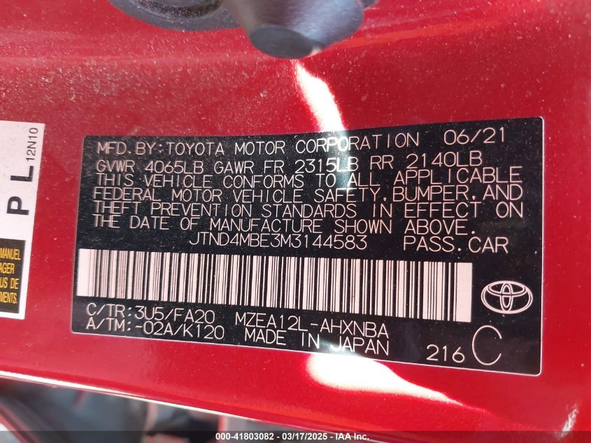 2021 TOYOTA COROLLA 2021 року Бензин, 2.0, Передний привод, vin - JTND4MBE3M3****** из США