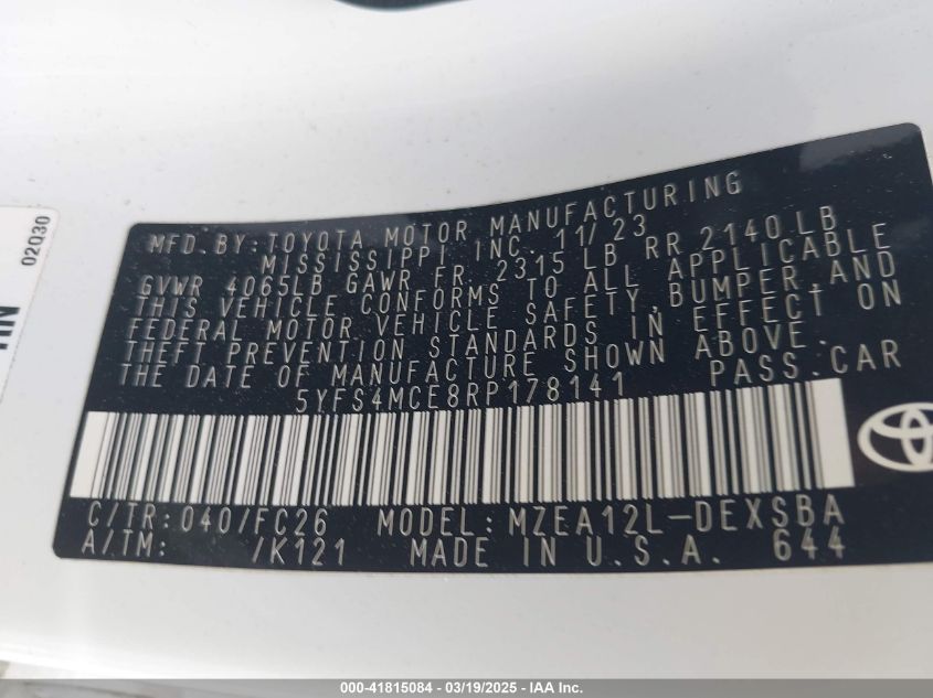 2024 TOYOTA COROLLA 2024 року Бензин, 2.0, Передний привод, vin - 5YFS4MCE8RP****** из США