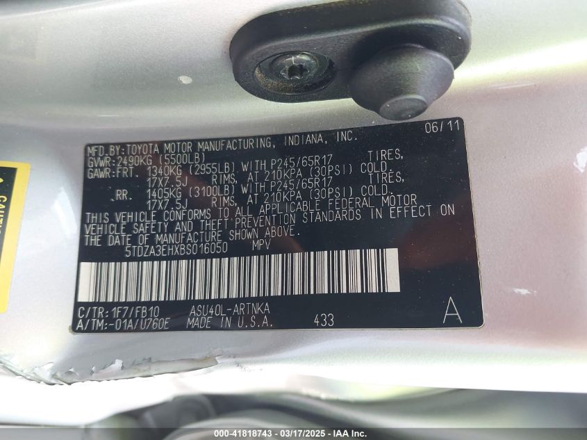 2011 TOYOTA HIGHLANDER 2011 року Бензин, 2.7, Передний привод, vin - 5TDZA3EHXBS****** из США