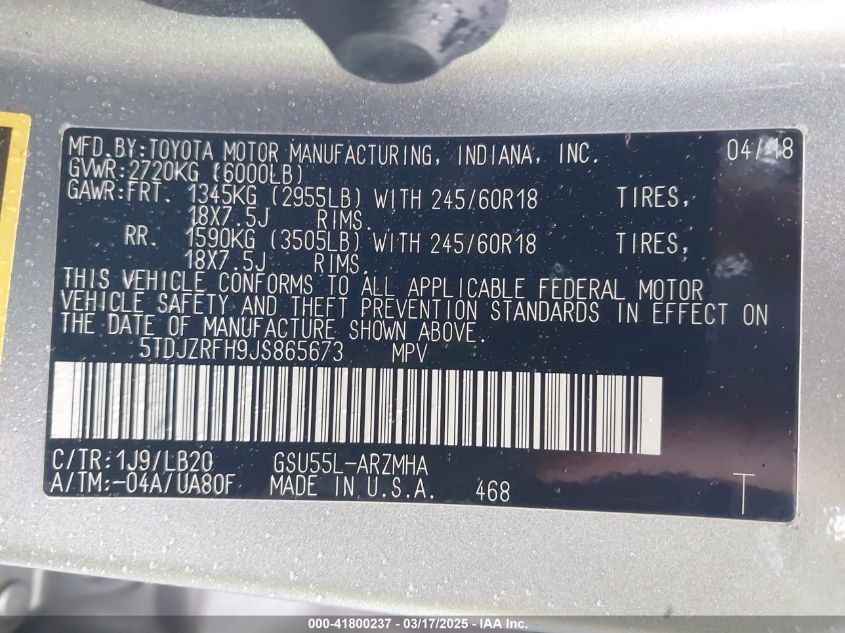 2018 TOYOTA HIGHLANDER 2018 року Бензин, 3.5, Полный привод, vin - 5TDJZRFH9JS****** из США