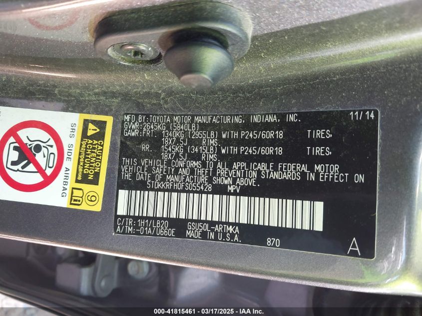2015 TOYOTA HIGHLANDER 2015 року Бензин, 3.5, Передний привод, vin - 5TDKKRFH0FS****** из США