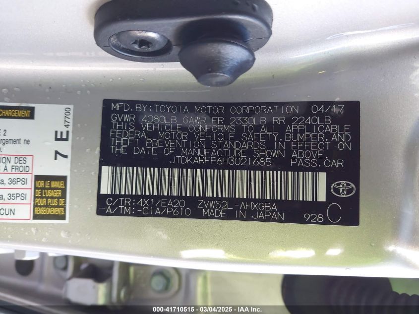 2017 TOYOTA PRIUS PRIME 2017 року Гибрид, 1.8, Передний привод, vin - JTDKARFP6H3****** из США