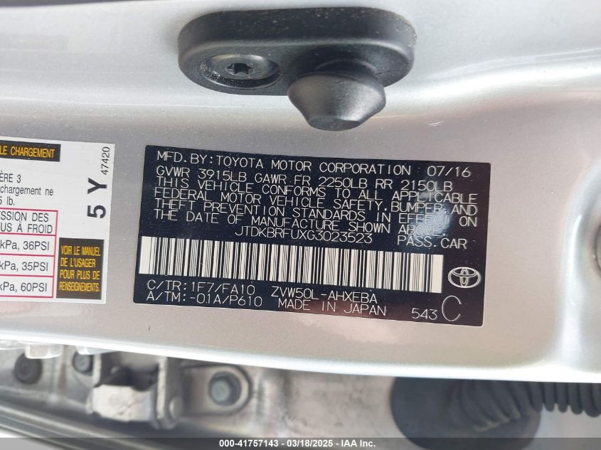 2016 TOYOTA PRIUS 2016 року Гибрид, 1.8, Передний привод, vin - JTDKBRFUXG3****** из США