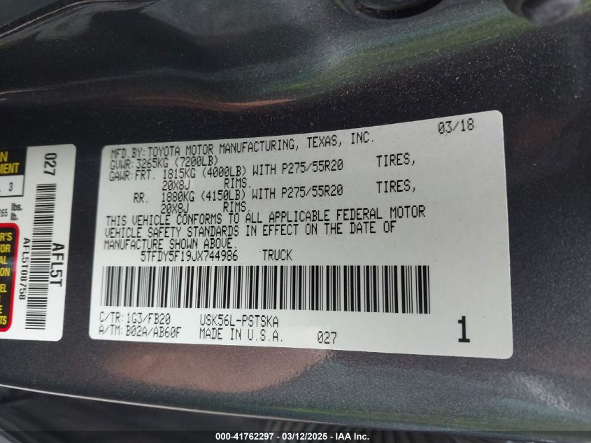 Цвет СерыйЦилиндры 8Привод Полный приводVIN 5TFDY5F19JX******Состояние НеизвестноПовреждения Правая сторонаДата аукциона 2025-03-24 AutoRIA