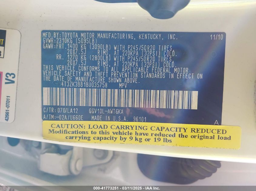2011 TOYOTA VENZA 2011 року Бензин, 3.5, Передний привод, vin - 4T3ZK3BB1BU****** из США