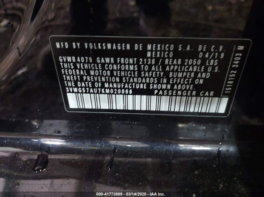 2019 VOLKSWAGEN GOLF 2019 року Бензин, 1.4, Передний привод, vin - 3VWG57AU7KM****** из США