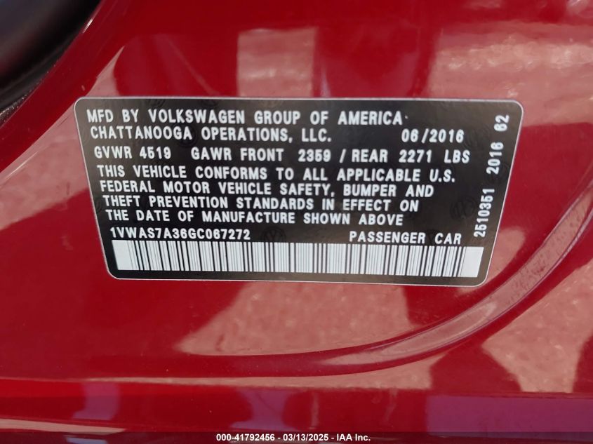 2016 VOLKSWAGEN PASSAT 2016 року Бензин, 1.8, Передний привод, vin - 1VWAS7A36GC****** из США