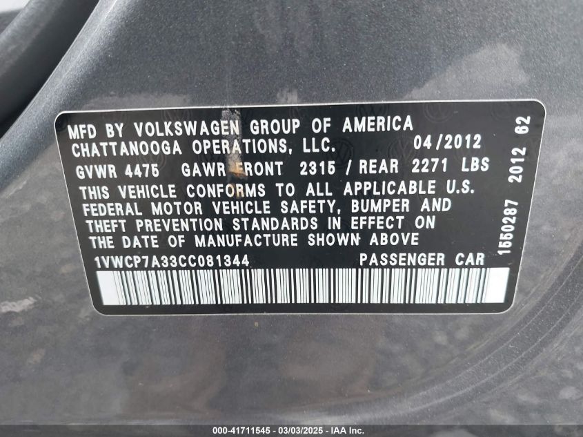 2012 VOLKSWAGEN PASSAT 2012 року Бензин, 2.5, Передний привод, vin - 1VWCP7A33CC****** из США