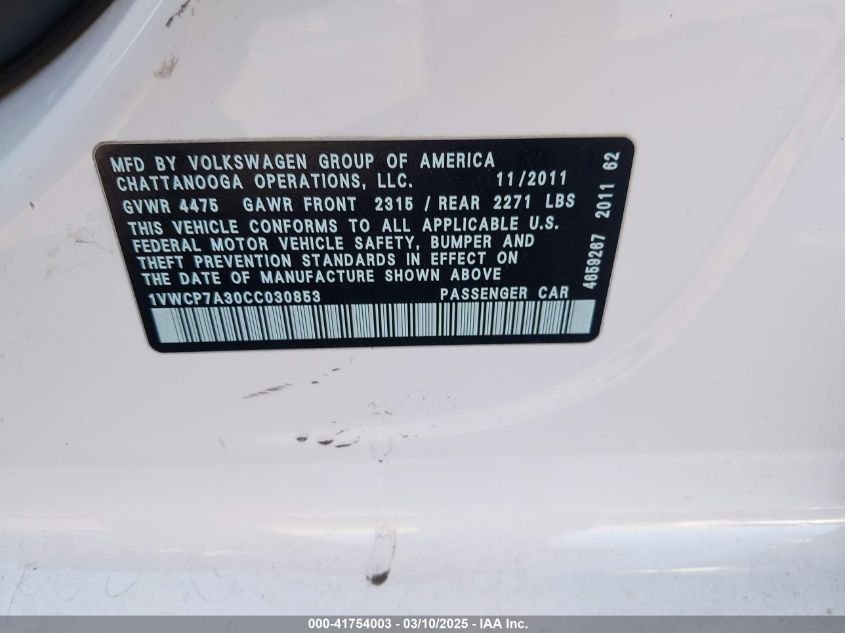 2012 VOLKSWAGEN PASSAT 2012 року Бензин, 2.5, Передний привод, vin - 1VWCP7A30CC****** из США