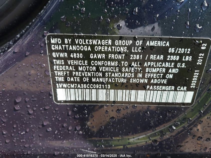 2012 VOLKSWAGEN PASSAT 2012 року Бензин, 3.6, Передний привод, vin - 1VWCM7A35CC****** из США