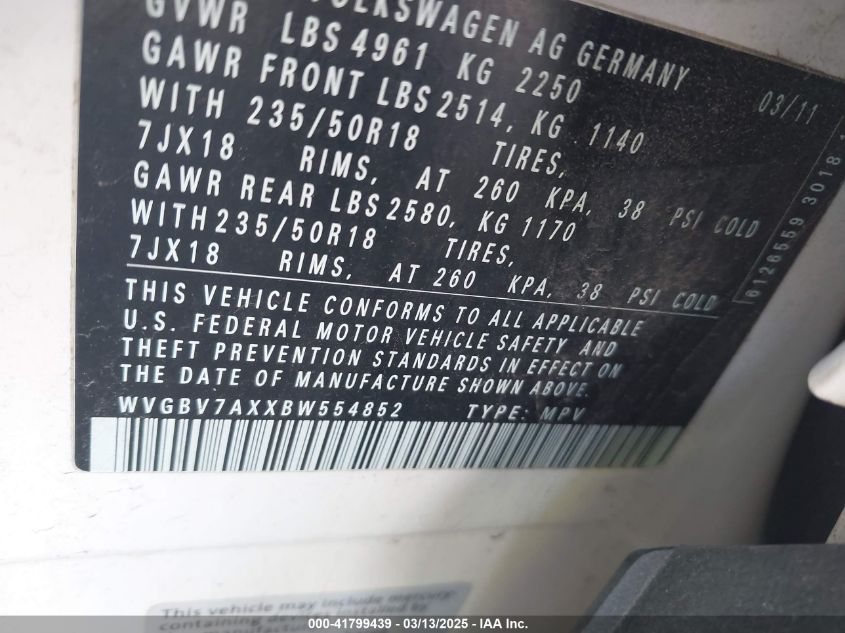 2011 VOLKSWAGEN TIGUAN 2011 року Бензин, 2.0, Полный привод, vin - WVGBV7AXXBW****** из США