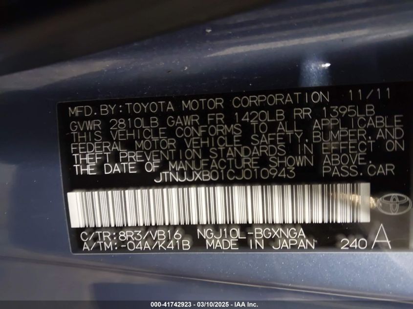 2012 SCION IQ 2012 Gasoline, 1.3, Front wheel drive, VIN - JTNJJXB01CJ****** from the USA